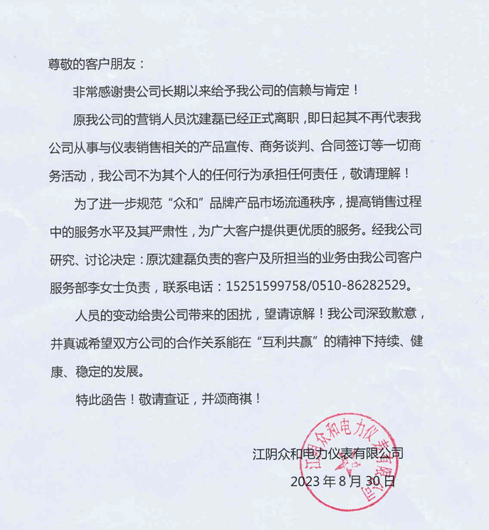 關于我司營銷人員沈建磊的離職公告函