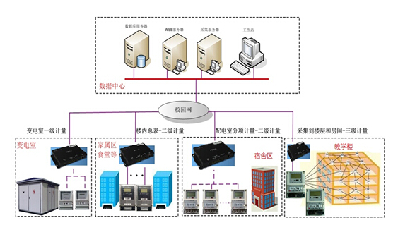 學(xué)校教學(xué)生活的電能計(jì)量監(jiān)管系統(tǒng)在按用電類型進(jìn)行分類的同時(shí),還要按電力用途分:教學(xué)樓、宿舍區(qū)、食堂、數(shù)據(jù)中心、變配電室等進(jìn)行計(jì)量、監(jiān)測(cè)、管理。